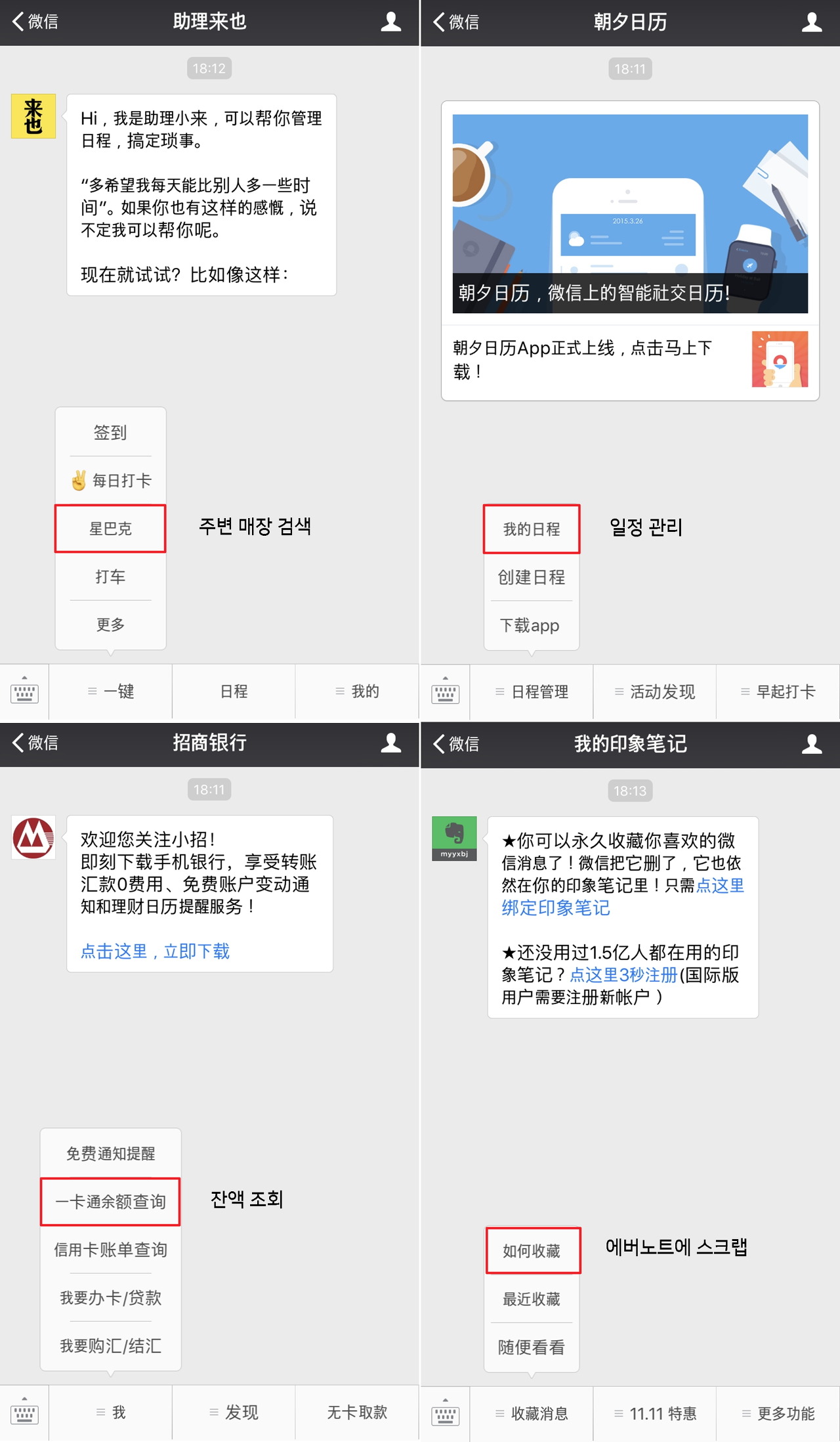 ๊ทธ๋Ÿผ ์„œ๋น„์Šคํ˜• ๊ณ„์ •์—” ์–ด๋–ค ๊ฒƒ๋“ค์ด ์žˆ์„๊นŒ์š”? ์ฃผ๋กœ ์ดˆ์ƒ์€ํ–‰์ด๋‚˜ [ๆœๅค•ๆ—ฅๅކ]์™€ ๊ฐ™์€ ์ผ์ • ๊ด€๋ฆฌ ์„œ๋น„์Šค ๊ณ„์ •์ด ์ž์ฃผ ์–ธ๊ธ‰๋ฉ๋‹ˆ๋‹ค. ๊ทธ ์™ธ์— [ๅŠฉ็†ๆฅไนŸ] ๊ณ„์ •์„ ์ด์šฉํ•ด ์ฃผ๋ณ€์— ์žˆ๋Š” ๋งค์žฅ์„ ๊ฒ€์ƒ‰ํ•˜๊ฑฐ๋‚˜, [ๆˆ‘็š„ๅฐ่ฑก็ฌ”่ฎฐ] ๊ณ„์ •์„ ํ†ตํ•ด ์œ„์ฑ— ๊ณต์‹ ๊ณ„์ •์— ์˜ฌ๋ผ์˜จ ๊ธ€๋“ค์„ ์—๋ฒ„๋…ธํŠธ๋กœ ์ €์žฅํ•  ์ˆ˜ ์žˆ์Šต๋‹ˆ๋‹ค.