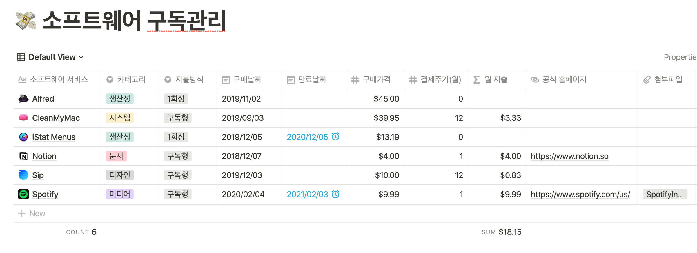 구매한 소프트웨어나 서비스가 많아질수록 라이선스 넘버, 영수증, 구매한 이메일 주소 등 반복적으로 기록해야 할 것들이 생기기 마련이다. 이렇게 반복적으로 기록해야 하는 것들은 Database 템플릿 기능을 활용하면 된다. 기본적인 구매 정보를 열거해보면 아래 4가지 정도 될 것 같다.