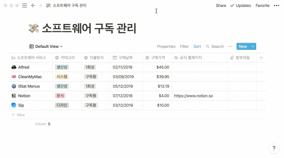소프트웨어를 추가하고 싶다면 좌측 하단 + New 버튼을 눌러 새로운 Page를 생성한다. 이 페이지에 서비스 이름, 카테고리, 구매날짜, 구매가격, 홈페이지 주소 등을 입력하면 된다. ▼