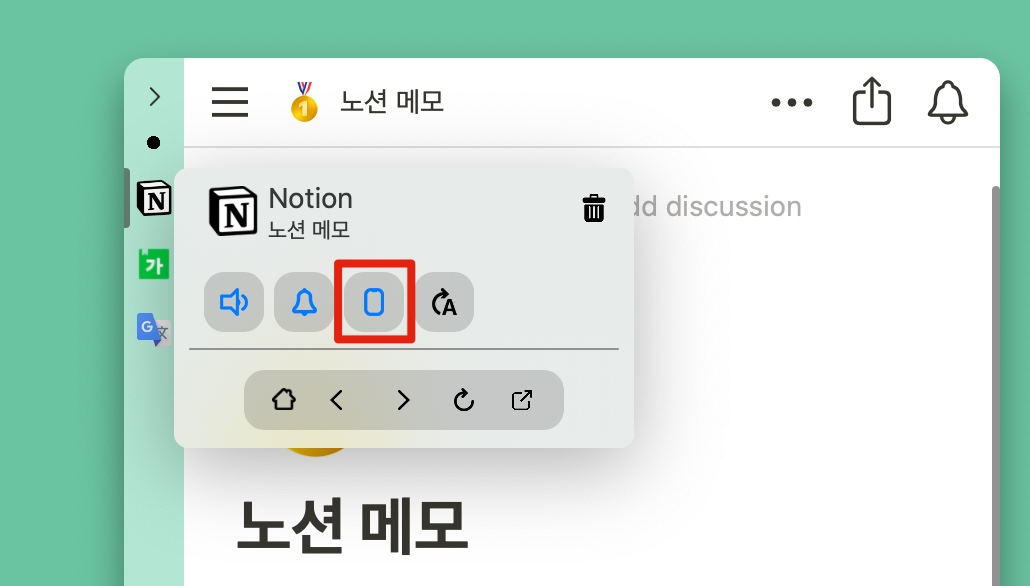 필요시 모바일 버전으로 전환해 사용할 수 있다. 좌측 노션 아이콘을 우클릭하면 선택 옵션이 나온다. ▼