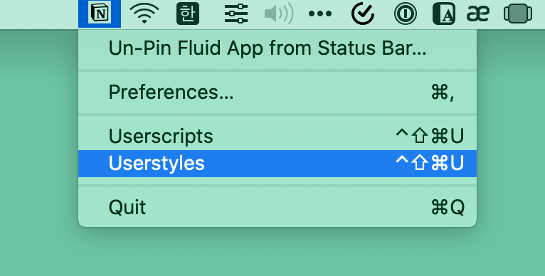 메뉴바의 Notion 앱 아이콘에 마우스 우클릭 > Userstyles 선택 ▼