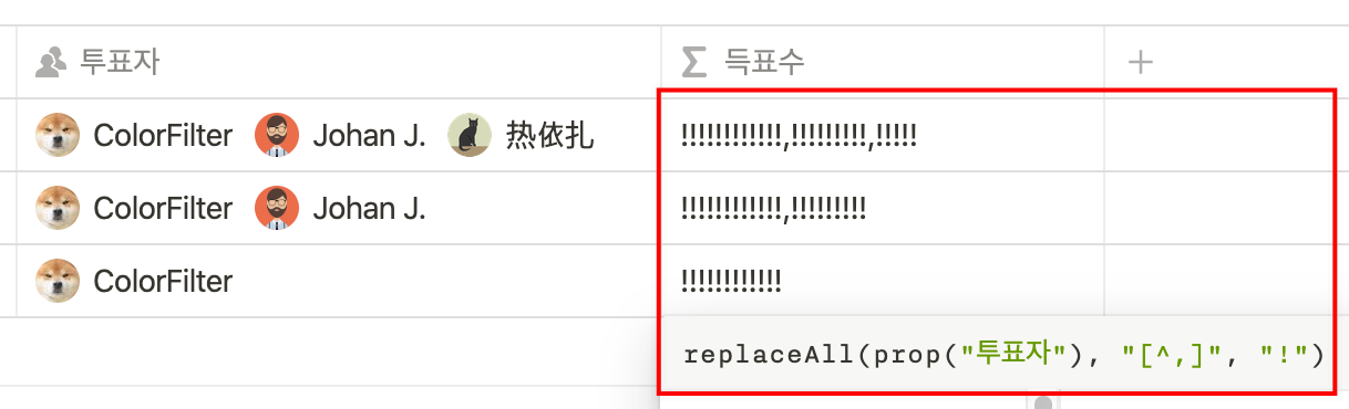 득표수 Formula에 prop("투표자")만 입력했을 땐 Member A, Member B 이런 식으로 멤버와 멤버 사이에 ","(콤마) 가 생기지만, replaceAll 함수를 사용하면 콤마를 모두 "!"(느낌표)로대치시킨다.