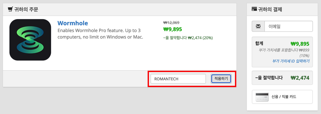 Wormhole 결제 페이지에서 위 코드를 입력하여 적용하면 됩니다. 무료 리딤코드를 사용하신 분은 다음 사람을 위해 댓글을 남겨주세요.