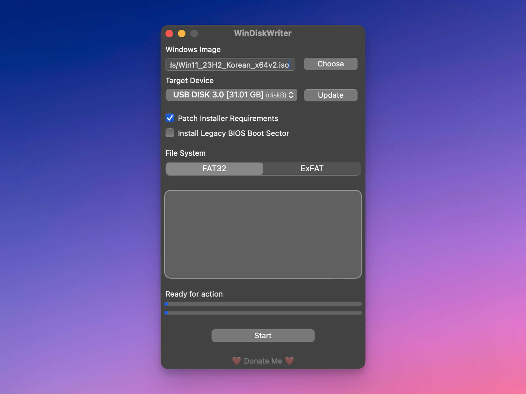 FAT32는 파일당 최대 4GB까지만 지원하는데, 윈도우 설치 이미지는 4GB를 훌쩍 넘는다. ExFAT 형식은 "상대적"으로 안정성이 낮고 호환성 문제가 발생할 수 있다는 점에서 고려하지 않았다. WinDiskWriter를 사용하면 자동으로 이미지 파일을 분할해 주기 때문에 FAT32 형식의 포맷을 그대로 사용할 수 있다.