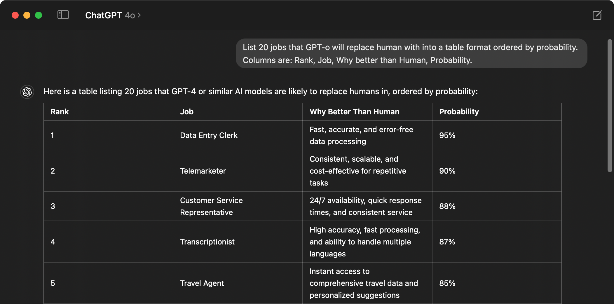 X(Twitter)를 보다가 흥미로운 게시물을 발견했다. GPT-4o가 인간을 대체할 수 있는 20개 직업과, 대체할 수 없는 20개 직업을 GPT-4o에게 물어본 결과였다. 궁금해서 직접 물어봤다.