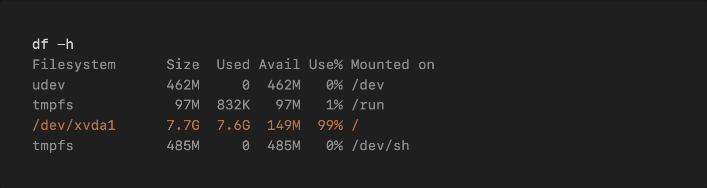 ๋ น์ด๋ก ๋์คํฌ ๊ณต๊ฐ์ด ๋ณํ๋์ง ํ์ธํด ๋ณธ๋ค. ๋๋ฐ์ด์ค ๋ณผ๋ฅจ์ ๋ํ๋ด๋ /dev/xvda1