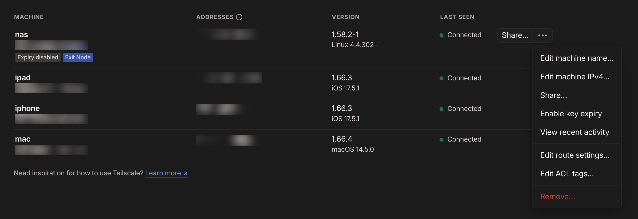 맥 혹은 아이폰에서 Tailscale을 연결하고 나스에 부여된 주소로 접속하면 끝. 정말 간단하다. Tailscale 콘솔에서 나스 접속 주소를 확인할 수 있다. Machine Name은 기기 이름으로 자동 등록되는데 우측에 있는 ... 더보기 버튼 → "Edit machine name" 을 눌러서 수정할 수 있다.
