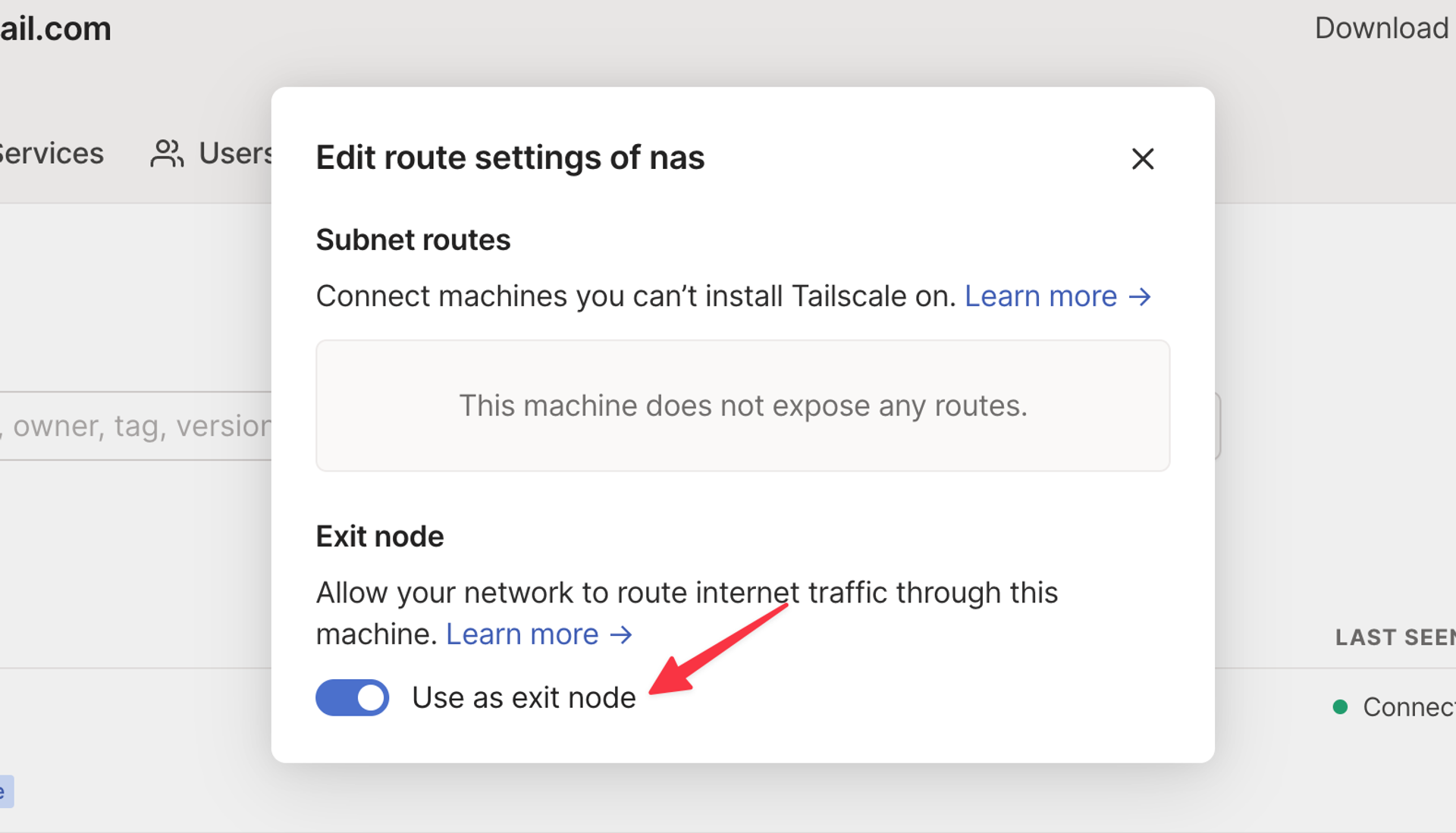 ❷ Tailscale 콘솔 → 나스 장치 우측 ... 클릭 → "Use as exit node" 체크 (Nas를 Exit Node로 설정)