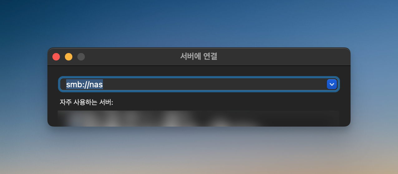 별다른 설정 없이 Tailscale에 연결된 상태에서 smb://MachineName 주소로 바로 접속할 수 있다. 예를 들어 기기 이름이 nas라면 smb://nas 주소로 접속하면 된다. 사용자 ID/PW는 나스 DSM 로그인 정보를 입력하면 된다. 참고로 맥북 파인더(Finder) 앱에서 CMD + K 단축키를 누르면 서버 연결 창이 뜬다. 이 창에 주소를 입력하고 연결하면 해당 서버의 공유 폴더가 마운트 된다.