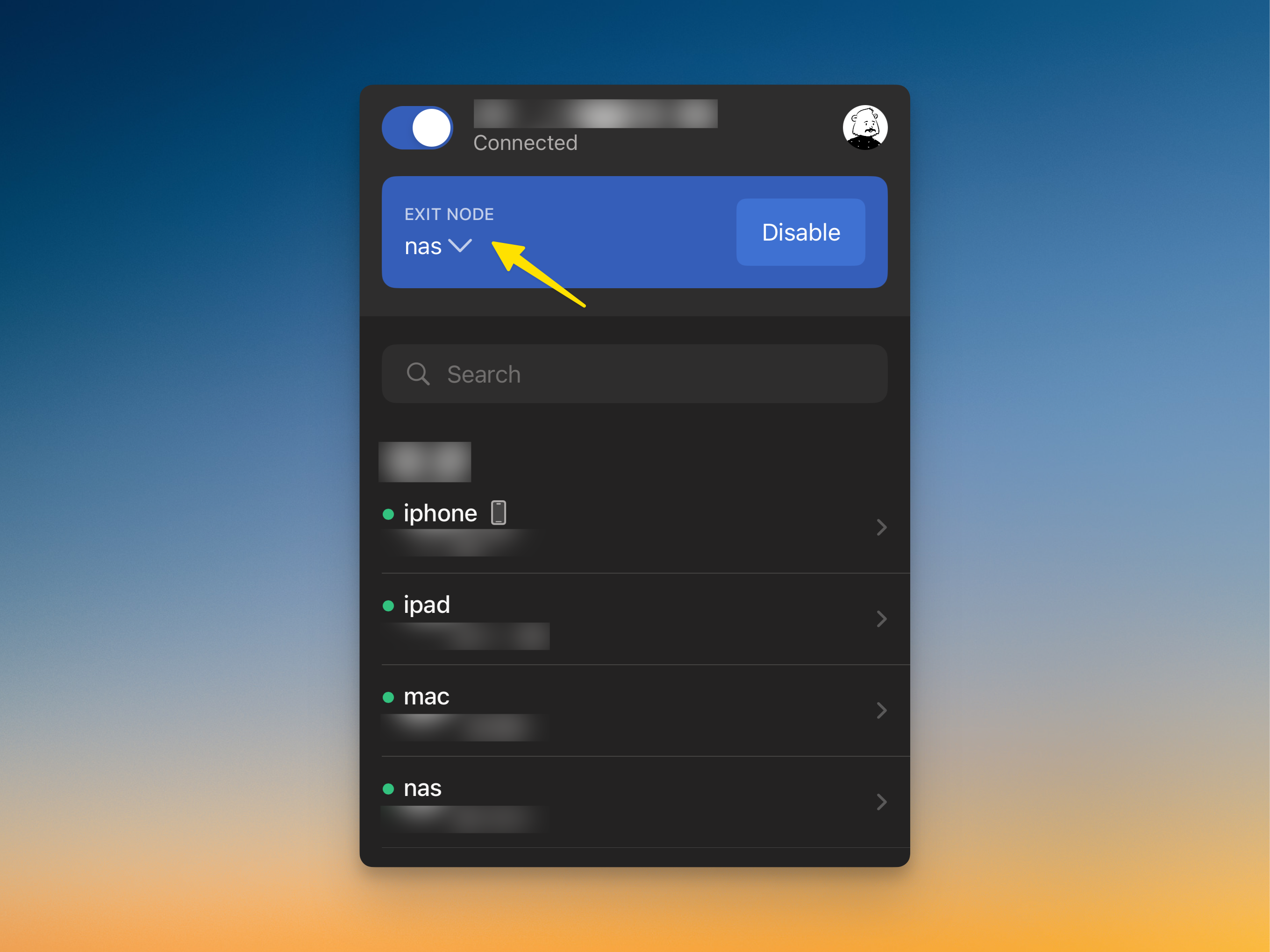 아래는 나스를 Exit Node로 설정하고 아이폰에서 Exit Node를 사용하는 예시.