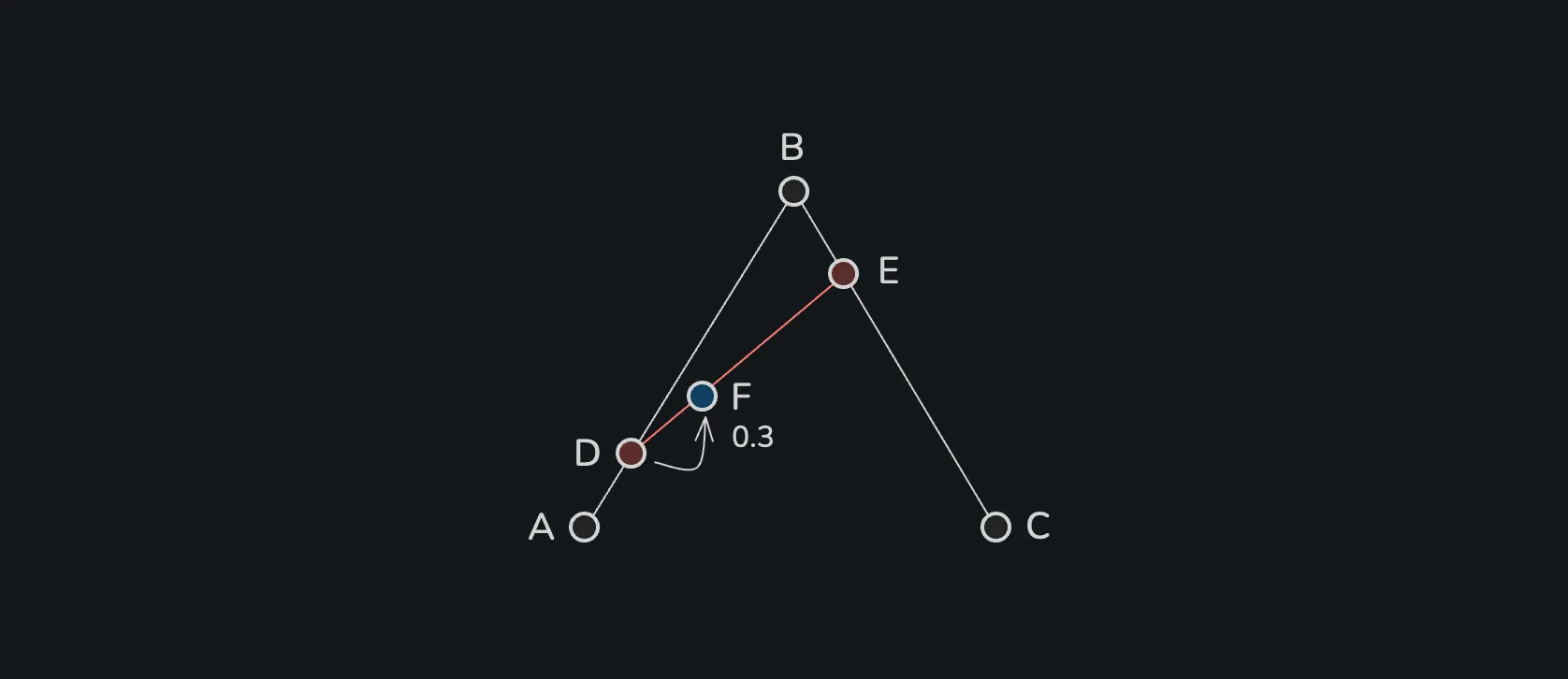 $t = 0.3$์ ์ถ๋ฐ์ $P_1$์์ ๋์ $P_2$ ๋ฐฉํฅ์ผ๋ก ์ ์ฒด ๊ฑฐ๋ฆฌ์ 30% ๋งํผ ์ด๋ํ ์ง์ ์ ์๋ฏธํ๋ค. ์ด ์ง์ ์ ์์น $P$๋ $P_1$๊ณผ $P_2$ ์์น์ ๊ฐ๊ฐ ๊ฐ์ค์น๋ฅผ ๊ณฑํ์ฌ ๋ํ๋ ๊ฐ์ค ํ๊ท (weighted average) ๋ฐฉ์์ผ๋ก ๊ณ์ฐํ ์ ์๋ค. ๊ฐ์ค ํ๊ท ์ ์์น๊ฐ ๋ ๊ฐ๊น์ด ์ง์ ์ ๋ ํฐ ๊ฐ์ค์น๋ฅผ ๋ถ์ฌํ๋ค. $t = 0.3$ ์ผ ๋ $P$๋ $P_1$์์ 30% ๋งํผ ๋จ์ด์ ธ ์๊ณ , $P_2$์ 70% ๋งํผ ๋จ์ด์ ธ ์์ผ๋ฏ๋ก $P_1$์ ๋ ๊ฐ๊น๋ค. ๋ฐ๋ผ์ $P_1$์ ๊ฐ์ค์น๋ฅผ 70%, $P_2$์ ๊ฐ์ค์น 30%๋ฅผ ์ ์ฉํ์ฌ ๊ฒฐ๊ณผ์ ์ผ๋ก $P = 0.7 \cdot P_1 + 0.3 \cdot P_2$ ์์์ด ์์ฑ๋๋ค.