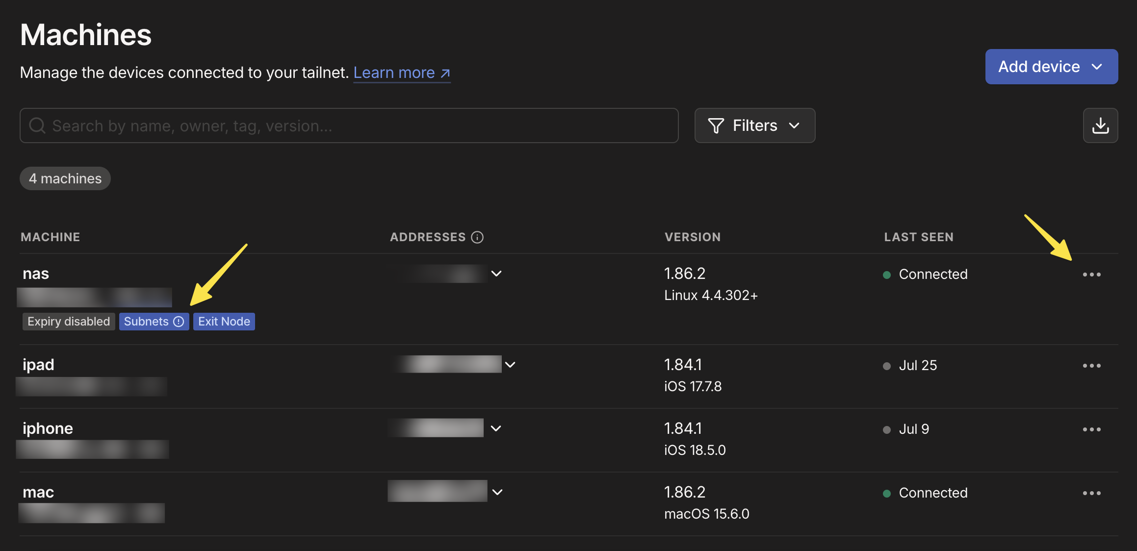 Tailscale 콘솔 > Machines 페이지를 보면 방금 설정한 시놀로지 NAS 기기에 파란색 Subnets 배지가 표시된 걸 확인할 수 있다.