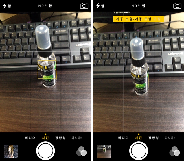 아이폰 카메라 모드에서 원하는 피사체 부분에 화면을 터치하면 해당 부분으로 포커스가 맞추어집니다. 일반 디지털카메라나 DSLR에서 지원하는 반셔터(셔터를 반 정도 누르고 있을 때에 맞추어진 초점 및 노출이 화면을 이동해도 그대로 유지되는 것) 기능 모두 자주 사용하실 텐데요, 이 반셔터 기능이 아이폰에도 존재합니다.